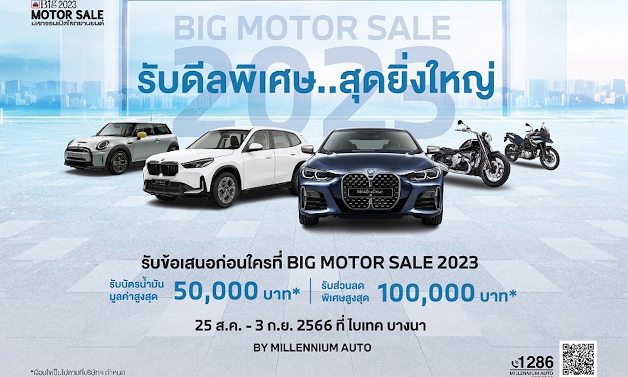 บริษัท มิลเลนเนียม ออโต๊ กรุ๊ป จำกัด ผู้จำหน่ายรถยนต์ บีเอ็มดับเบิลยู, มินิ และมอเตอร์ไซค์ บีเอ็มดับเบิลยู มอเตอร์ราด อย่างเป็นทางการ ภายใต้บริษัท มิลเลนเนียม กรุ๊ป คอร์ปอเรชั่น (เอเชีย) จำกัด (มหาชน) ตอบรับสภาพเศรษฐกิจที่สดใส ไปพร้อมกับความเชื่อมั่นของผู้บริโภคที่เพิ่มสูงขึ้น จัดเต็มสำหรับลูกค้า กับแคมเปญ ‘INIFINITE DEAL’ ที่งาน BIG MOTOR SALE 2023 ยกทัพยนตรกรรมหลากรุ่น ทั้งรถยนต์และมอเตอร์ไซค์ มาพร้อมข้อเสนอดีๆ ระหว่างวันที่ 25 สิงหาคม ถึง 3 กันยายน 2566 ณ ศูนย์นิทรรศการและการประชุมไบเทค บางนา
