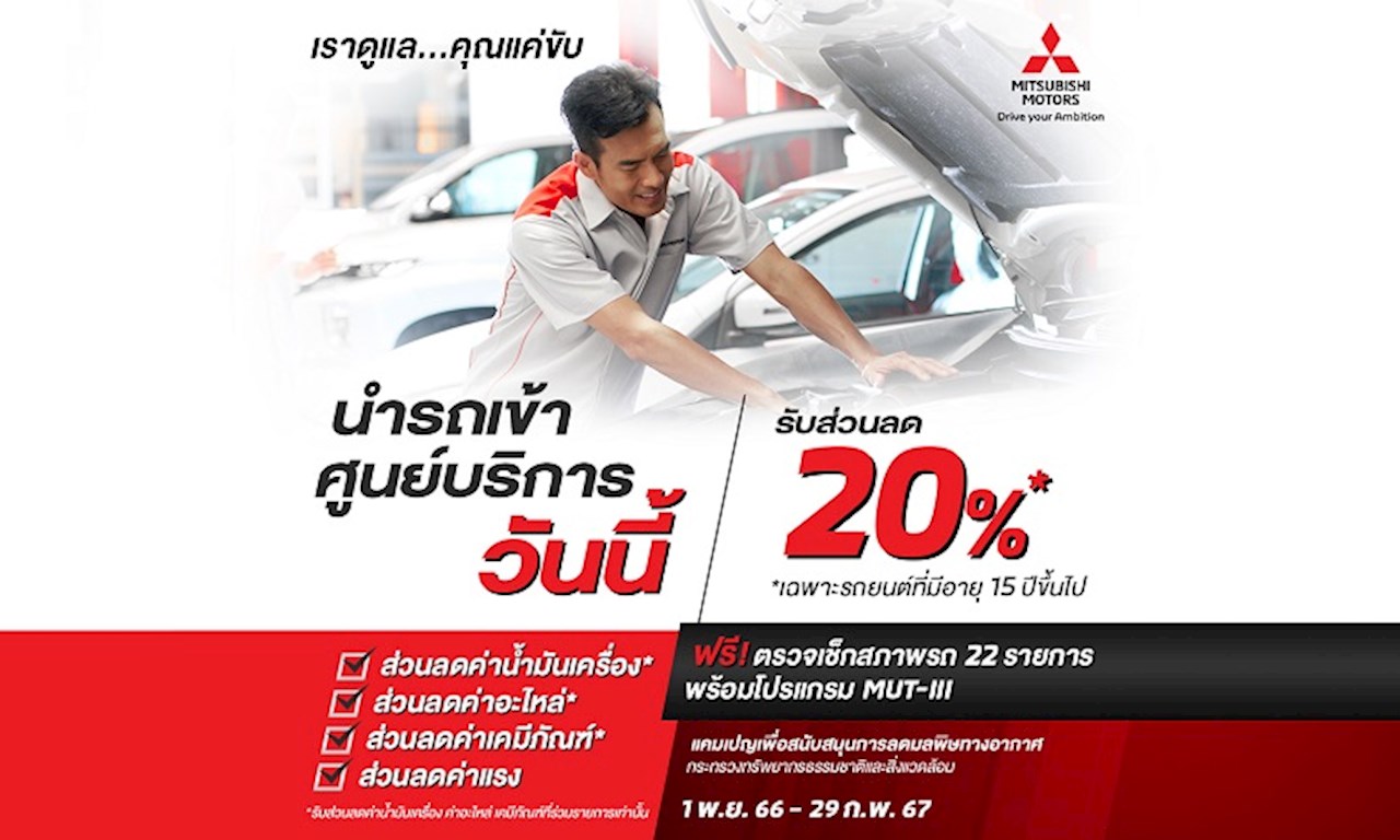 บริษัท มิตซูบิชิ มอเตอร์ส (ประเทศไทย) จำกัด มอบส่วนลดพิเศษ 20% ค่าน้ำมันเครื่อง อะไหล่ เคมีภัณฑ์ที่ร่วมรายการ และค่าแรง พร้อมบริการตรวจเช็กสภาพรถ 22 รายการ และโปรแกรมตรวจเช็กเครื่องยนต์ด้วยระบบคอมพิวเตอร์ MUT-III ฟรี สำหรับรถยนต์มิตซูบิชิที่มีอายุ 15 ปีขึ้นไป เมื่อลูกค้านำรถเข้าศูนย์บริการของมิตซูบิชิ มอเตอร์ส ทั่วประเทศ วันนี้ – 29 กุมภาพันธ์ 2567 ตอกย้ำความมุ่งมั่นในการสร้างความพึงพอใจสูงสุดให้แก่ลูกค้า และพัฒนาคุณภาพด้านบริการหลังการขาย ภายใต้แนวคิด ‘เราดูแล คุณแค่ขับ’ ที่มุ่งเน้นให้ความสำคัญกับลูกค้าเป็นอันดับหนึ่ง