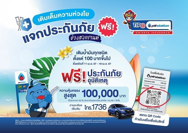 เดินทางไปไหนก็อุ่นใจตลอดเทศกาลสงกรานต์ เลือกความคุ้มค่า เลือกเติมน้ำมันที่ พีทีที สเตชั่น ทุกสาขาทั่วประเทศที่ร่วมรายการ รับประกันภัยฟรี! ตั้งแต่ 11 เมษายน 2567 – 18 เมษายน 2567