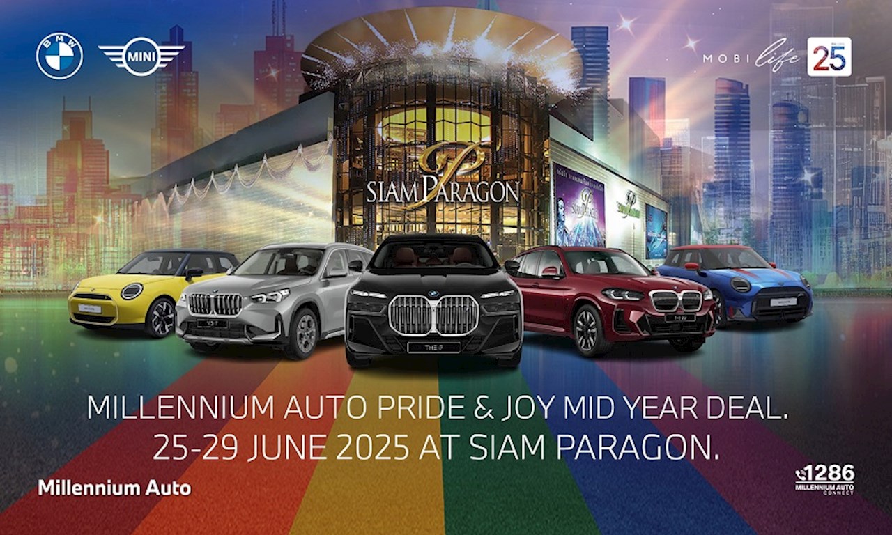 บริษัท มิลเลนเนียม ออโต๊ กรุ๊ป จำกัด ผู้จำหน่ายรถยนต์ บีเอ็มดับเบิลยู, มินิ และมอเตอร์ไซค์ บีเอ็มดับเบิลยู มอเตอร์ราด อย่างเป็นทางการในเครือ MGC-ASIA จัดแคมเปญพิเศษ ‘PRIDE & JOY MID YEAR DEAL’ ยกขบวนยนตรกรรมหรูสุดพรีเมียม ส่งตรงใจกลางกรุงเทพฯ ระหว่างวันที่ 25-29 มิถุนายน 2568 ณ แฟชั่นฮอลล์ ชั้น 1 ศูนย์การค้าสยามพารากอน หรือรับข้อเสนอพิเศษได้ตลอดเดือน ที่โชว์รูมมิลเลนเนียม ออโต้ ทุกสาขา ทั้งในกรุงเทพฯ คือ พระราม 4, ลาดพร้าว, พระราม 3, พัฒนาการ-ศรีนครินทร์, สยามพารากอน, ไอคอนสยาม และ มินิ เอกมัย รวมถึงต่างจังหวัด คือ อุบลราชธานี, หาดใหญ่, ภูเก็ต และสุราษฎร์ธานี