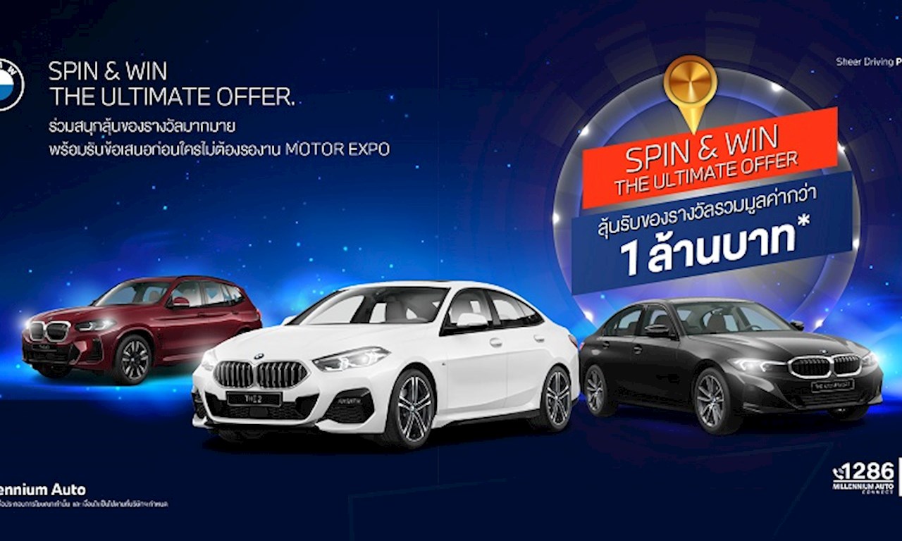 บริษัท มิลเลนเนียม ออโต๊ กรุ๊ป จำกัด ผู้จำหน่ายรถยนต์ บีเอ็มดับเบิลยู อย่างเป็นทางการ ภายใต้บริษัท มิลเลนเนียม กรุ๊ป คอร์ปอเรชั่น (เอเชีย) จำกัด (มหาชน) หรือ MGC-ASIA จัดหนักแคมเปญส่งท้ายปี ‘SPIN & WIN THE ULTIMATE OFFER’ หยิบยื่นหลากหลายข้อเสนอสุดพิเศษสำหรับยนตรกรรม บีเอ็มดับเบิลยู ทุกรุ่นแบบไม่ต้องรองาน มอเตอร์ เอ็กซ์โป วันนี้ ถึงสิ้นเดือนพฤศจิกายน 2567 ที่โชว์รูม บีเอ็มดับเบิลยู มิลเลนเนียม ออโต้ ทุกสาขา