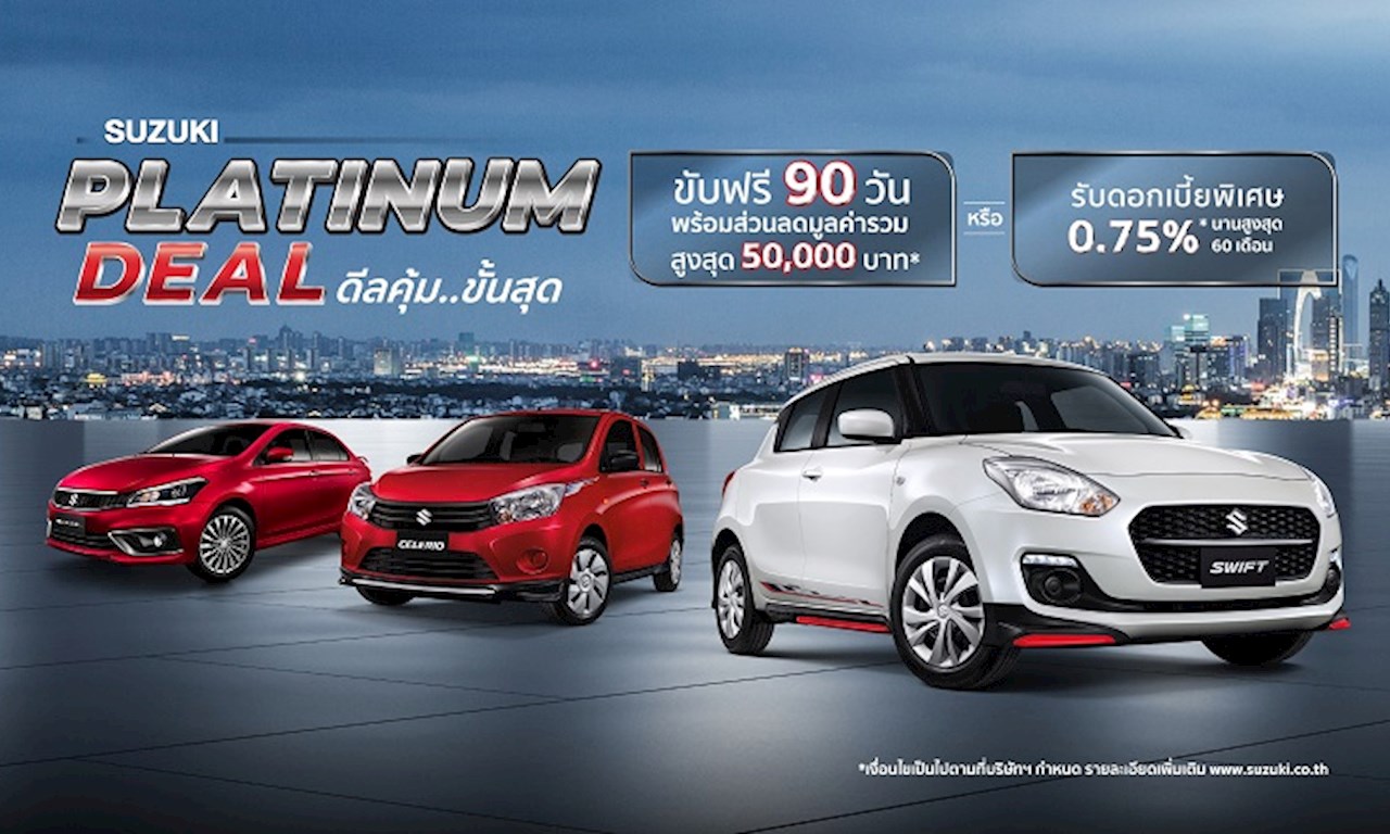 แคมเปญพิเศษ “SUZUKI PLATINUM DEAL ดีลคุ้ม..ขั้นสุด” ให้ลูกค้าสามารถเลือกรับข้อเสนอสุดคุ้มในทุกเงื่อนไขได้มากกว่าที่เคย ไม่ว่าจะเป็น ข้อเสนอขับฟรี 90 วัน พร้อมรับส่วนลดอุปกรณ์ตกแต่งมูลค่ารวมสูงสุด 50,000 บาท หรือจะเลือกรับดอกเบี้ยพิเศษเริ่ม 0.79% นาน 60 เดือน พร้อมฟรีประกันภัยชั้นหนึ่งทุกรุ่น โดยแคมเปญ “SUZUKI PLATINUM DEAL ดีลคุ้ม..ขั้นสุด” จะเริ่มตั้งแต่วันนี้ ถึงวันที่ 7 เมษายน 2567 ซึ่งมีรายละเอียดดังนี้