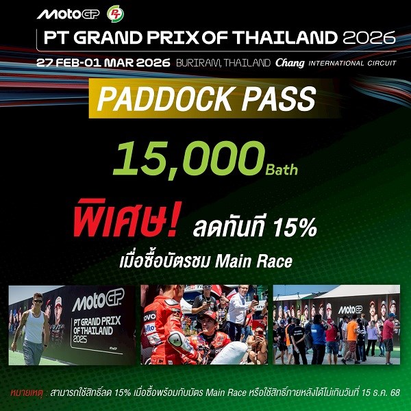 7. บัตร Paddock Pass สามารถเข้าสู่โซน Paddock ของนักแข่งระดับโลกอย่างใกล้ชิด ขอลายเซ็น และถ่ายรูปแบบเอ๊กซ์คลูซีฟ ในราคา 15,000 บาท ซึ่งเมื่อซื้อพร้อมบัตร Main Race จะได้รับส่วนลดพิเศษ 15% เหลือเพียง 12,750 บาท และสิทธิ์เข้าชม Pre-Season Test ฟรี!