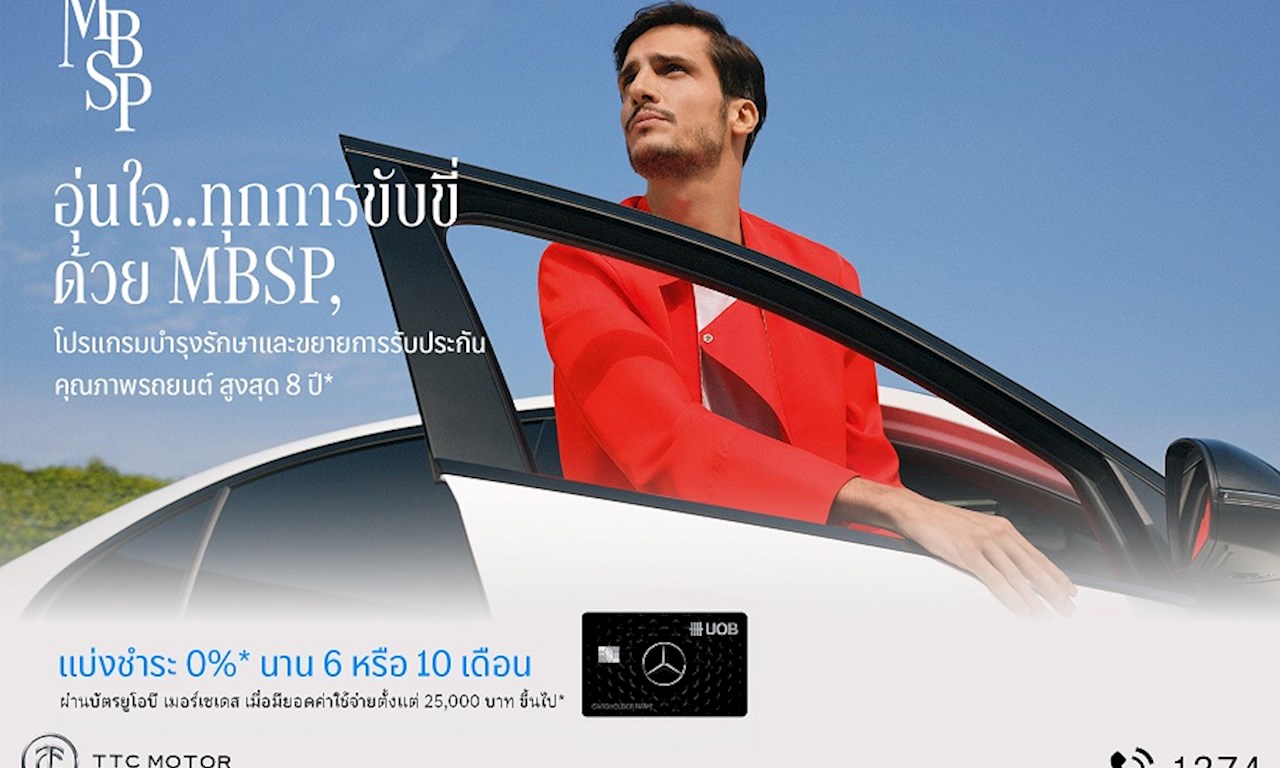 TTC Motor จัดแคมเปญ อุ่นใจ...ทุกการขับขี่ Mercedes-Benz ด้วย MBSP โปรแกรมบำรุงรักษาและขยายการรับประกันคุณภาพรถยนต์สูงสุด 8 ปี มาด้วยกัน 3 โปรแกรม Easy Care Program, Extra Guarantee Program, Ultimate Program สิทธิพิเศษ! สำหรับสมาชิกบัตร UOB Mercedes สามารถผ่อนชำระ 0%* นาน 6 หรือ 10 เดือน เมื่อซื้อหรืออัพเกรดโปรแกรม MBSP ยอดใช้จ่ายตั้งแต่ 25,000 บาท* ขึ้นไป