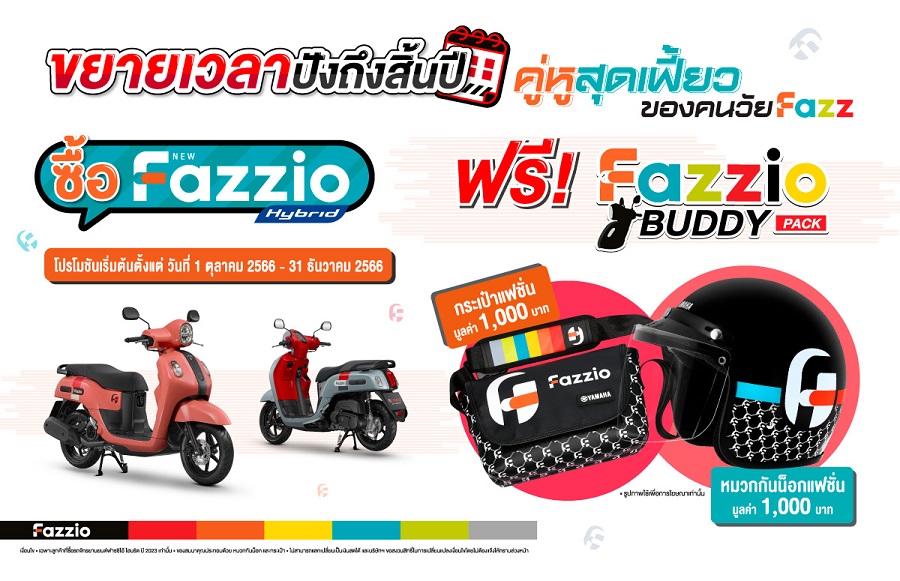 บริษัท ไทยยามาฮ่ามอเตอร์ จำกัด ขยายเวลาโปรโมชัน “Fazzio BUDDY PACK” เมื่อซื้อรถจักรยานยนต์ ยามาฮ่า ฟาซซิโอ้ (YAMAHA FAZZIO) ระหว่างวันที่ 1 ตุลาคม 2566 ถึงวันที่ 31 ธันวาคม 2566 รับชุดคู่หูสุดเฟี้ยว Limited Edition หมวกกันน็อก FAZZIO พร้อมกระเป๋าสะพายข้างแฟชั่น รวมมูลค่า 2,000 บาท ทันที พร้อมการรับประกัน 5 ปี หรือ 50,000 กม. ทุกคัน