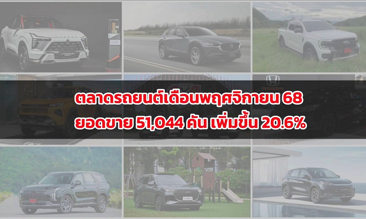 ตลาดรถยนต์เดือนพฤศจิกายน 2568 มียอดขาย 51,044 คัน เพิ่มขึ้นถึง 20.6% เมื่อเทียบกับช่วงเดียวกันของปีที่ผ่านมาแสดงถึงสัญญาณเชิงบวกของตลาดรถยนต์