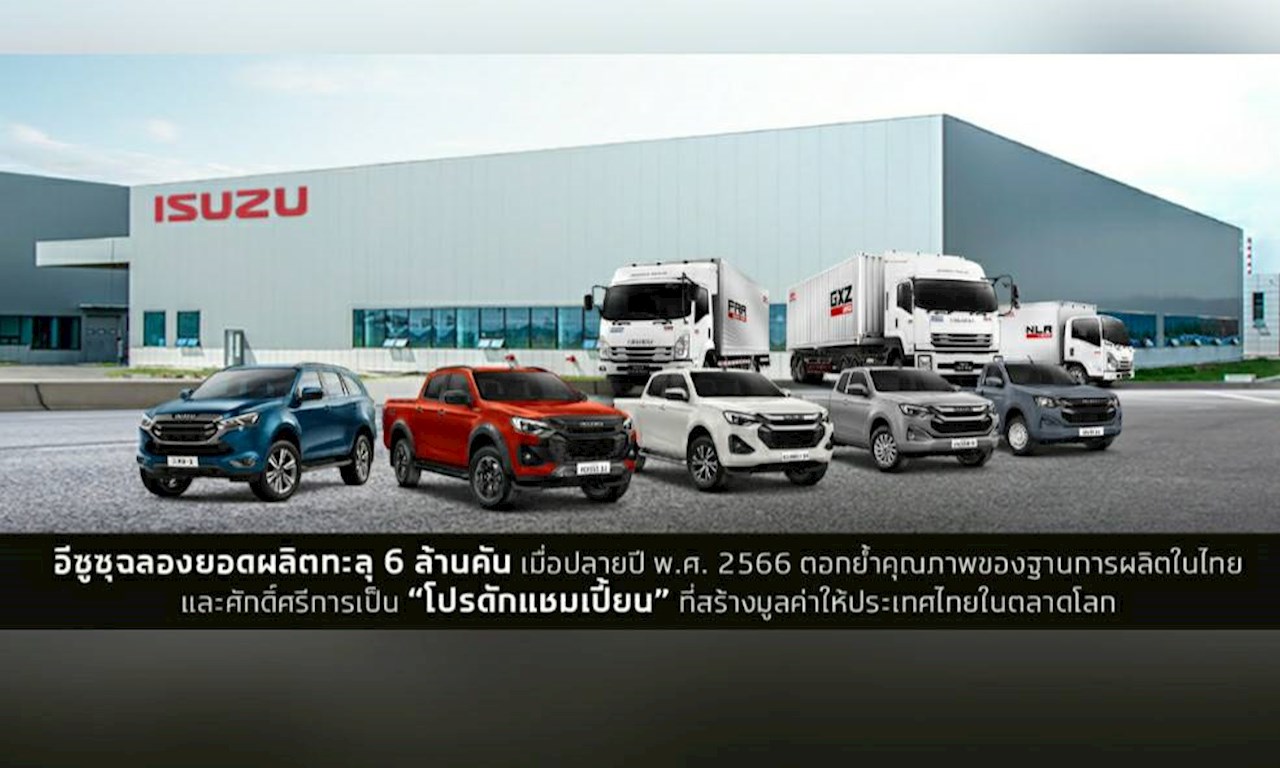 อีซูซุสร้างปรากฏการณ์แห่งความสำเร็จครั้งประวัติศาสตร์อีกครั้ง ด้วยการประกาศยอดผลิตรถยนต์จากฐานการผลิตในประเทศไทยครบ 6 ล้านคัน ซึ่งเป็นยอดจำหน่ายในประเทศ 4 ล้านคัน โดยเป็นรถปิกอัพกว่า 3 ล้านคัน และส่งออกอีก 2 ล้านคัน นับเป็นการเติบโตแบบก้าวกระโดดสมศักดิ์ศรีการเป็น “โปรดักแชมเปี้ยน” ที่ได้รับการยอมรับในตลาดโลก ทั้งหมดนี้เกิดจากความเชื่อมั่นและไว้วางใจของลูกค้าที่มีต่อแบรนด์ “อีซูซุ” ในฐานะแบรนด์ชั้นนำของประเทศ พร้อมเผยจะทุ่มการลงทุนอีก 32,000 ล้านบาท ภายใน 5 ปีนี้ เพื่อมุ่งสู่การวางรากฐานยานยนต์อนาคต