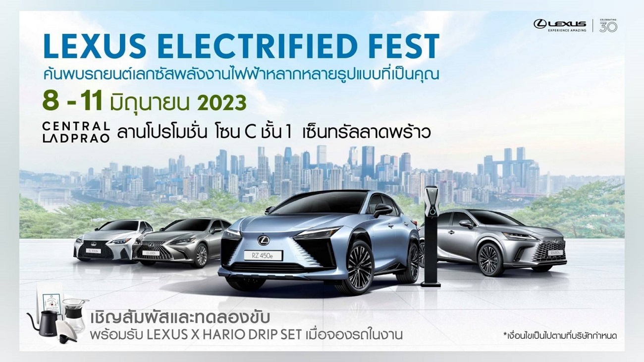เชิญพบกับ Lexus Electrified Fest งานแสดงสุดยอดยนตรกรรมไฟฟ้า Lexus Electrified ที่จะไปให้คุณได้สัมผัสอย่างใกล้ชิดถึงใจกลางเมือง พร้อมทดลองขับ The All-Electric Lexus RZ และรถยนต์เลกซัสอีกหลากหลายรุ่น อาทิ RX NX ES IS และ UX พร้อมรับข้อเสนอสุดพิเศษ และของสมมนาคุณ Lexus x Hario Drip Set (มีจำนวนจำกัด) เมื่อจองรถภายในงาน พบกันที่โซน C ชั้น 1 เซ็นทรัลลาดพร้าว ตั้งแต่วันที่ 8 – 11 มิถุนายน ศกนี้