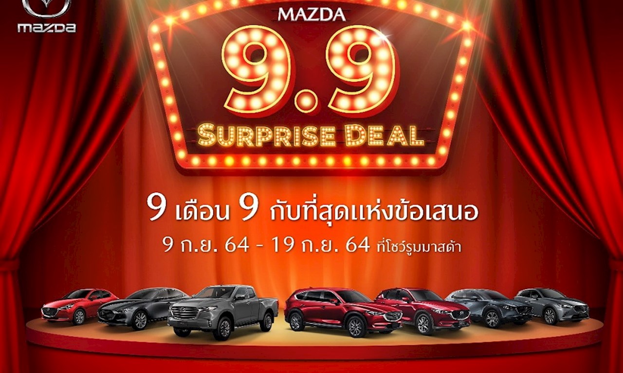 มาสด้า อัดแคมเปญแรง “Mazda 9.9 Surprise Deal” 9 เดือน 9 กับที่สุดแห่งข้อเสนอ มอบความพิเศษให้ลูกค้าที่สนใจออกรถใหม่ ระหว่างวันที่ 9 – 19 กันยายน 2564 ด้วยดอกเบี้ยต่ำสุด 0% ขับฟรี 90 วัน ฟรีประกันชั้น 1 Mazda Premium Insurance ฟรีของพรีเมี่ยมสุดพิเศษมูลค่า 690 บาท เมื่อจองภายในงานฯ ที่โชว์รูมมาสด้าทั่วประเทศ พร้อมมอบสิทธิพิเศษให้ลูกค้าที่นำรถมาเข้ารับบริการที่ศูนย์บริการมาสด้า ฟรีบริการฉีดพ่นน้ำยาฆ่าเชื้อภายในรถยนต์ รับส่วนลดค่าแรง 50% อุปกรณ์ตกแต่งแท้ราคาเริ่มต้นเพียง 999 บาท พร้อมโปรแกรมผ่อนชำระสบาย ๆ 0% นานสูงสุด 10 เดือน ระหว่างวันที่ 9 - 30 กันยายน 2564 นี้