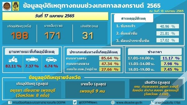 กรมป้องกันและบรรเทาสาธารณภัย ศูนย์อำนวยการป้องกันและลดอุบัติเหตุทางถนนช่วงเทศกาลสงกรานต์ พ.ศ.2565 สรุปสถิติอุบัติเหตุทางถนนประจำวันที่ 17 เมษายน 2565 เกิดอุบัติเหตุ 188 ครั้ง ผู้บาดเจ็บ 171 คน ผู้เสียชีวิต 31 ราย สถิติอุบัติเหตุสะสม 7 วัน (11 - 17 เมษายน 2565) ซึ่งเป็นวันสุดท้ายของการดำเนินงานป้องกันและลดอุบัติเหตุทางถนน เกิดอุบัติเหตุรวม 1,917 ครั้ง ผู้บาดเจ็บ 1,869 คน ผู้เสียชีวิต 278 ราย