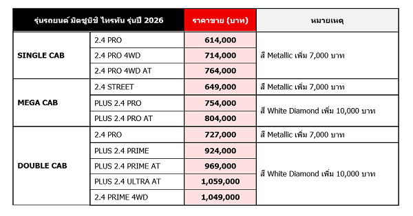 ราคาขาย มิตซูบิชิ ไทรทัน รุ่นปี 2026