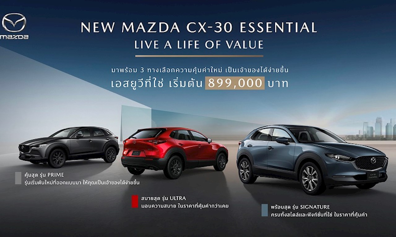 มาสด้าเผยโฉมอีกหนึ่งยนตรกรรมภายใต้ ESSENTIAL COLLECTION ครอสโอเวอร์เอสยูวีสปอร์ตพรีเมี่ยม NEW MAZDA CX-30 ESSENTIAL ภายใต้แนวคิด “LIVE A LIFE OF VALUE” เติมเต็มชีวิตให้คุ้มค่ากับเอสยูวีที่ใช่ ตอบโจทย์ทุกความต้องการ สง่างามด้วย โคโดะ ดีไซน์ ที่ออกแบบภายใต้คอนเซ็ปต์ “Less is More” เรียบง่ายแต่งดงาม คงไว้ซึ่งความโฉบเฉี่ยวและทรงพลัง มาพร้อมระบบควบคุมสมรรถนะการขับขี่อัจฉริยะขั้นสูง GVC Plus เหนือระดับด้วยเครื่องยนต์สกายแอคทีฟเบนซิน 2.0 ลิตร ทั้งแรงและประหยัดน้ำมัน ตอบสนองดีที่สุดให้กำลังสูงสุด 165 แรงม้า สัมผัสประสบการณ์ใหม่แห่งการควบคุมการขับขี่ที่แม่นยำและสมดุล ด้วยสกายแอคทีฟแพลตฟอร์มเจเนอเรชั่นใหม่ อัดแน่นด้วยเทคโนโลยีความปลอดภัยรอบคัน ราคาจำหน่ายเริ่มต้นเพียง 899,000 บาท ดอกเบี้ย 2.49% ฟรีประกันภัยชั้นหนึ่ง Mazda Premium Insurance 1 ปี พิเศษสุด ลูกค้า Mazda Family รับฟรีบัตรน้ำมันมูลค่า 20,000 บาท สนใจสอบถามข้อมูลเพิ่มเติมได้ที่โชว์รูมมาสด้าทั่วประเทศ หรือเว็บไซต์ www.mazda.co.th